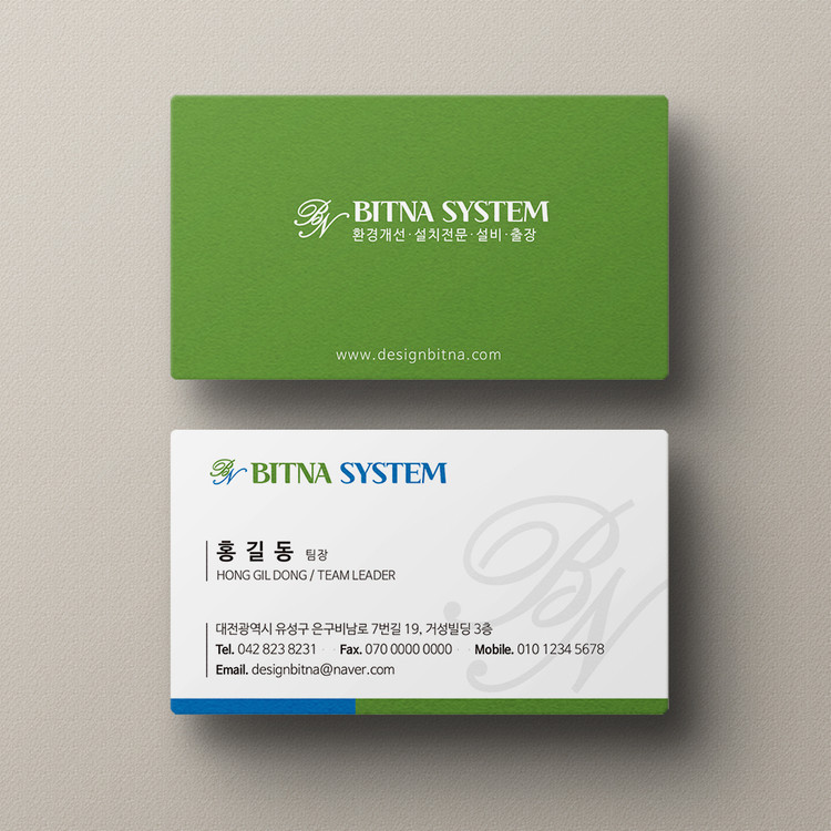 블루와 그린의 조화가 세련됨을 이루도록 제작된 기업 명함